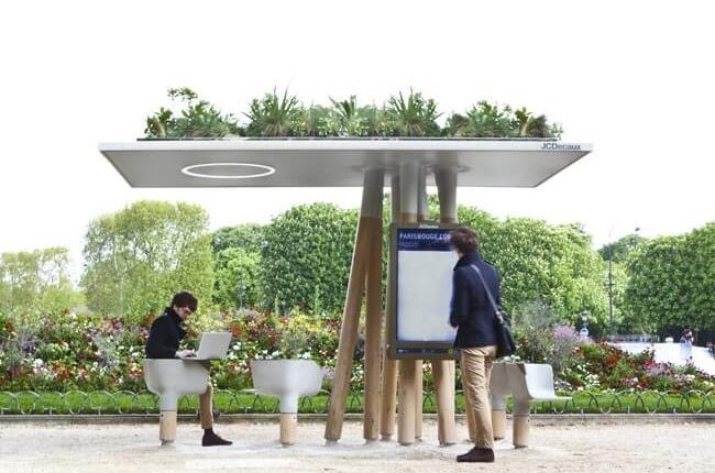 Udah tahu belum ini apa? Ini adalah wi-fi area di trotoar jalanan. Wah, keren banget nih. Jadi kalau mau internetan gratis nggak perlu lagi ke kafe mahal tapi di pinggir jalan pun jadi. Tempatnya pun nggak kalah cozy sama kafe. Bagian atas dari wi-fi area in bisa ditanami tumbuhan karena memang niatnya supaya bisa go-green juga. Super!
