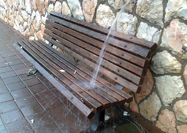 Mungkin bapak yang pasang bangku ini nggak tau kali ya kalau lubang itu saluran air. Jadi mubazir deh kursinya.