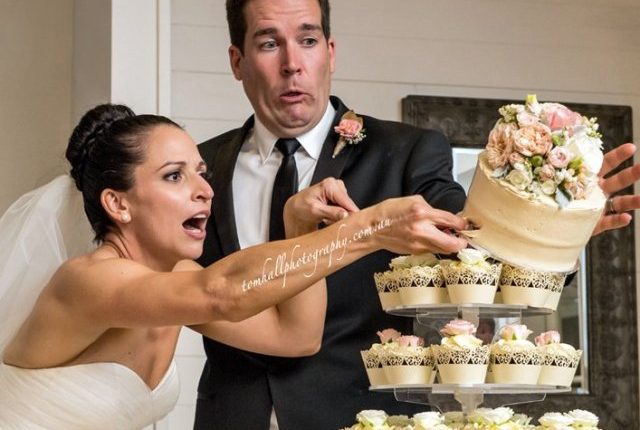 Kue pernikahan udah bagus, gaun bagus, acara hampir sempurna, sampai akhirnya meja kue mungkin ada yang pendek atau di fotografer nggak sengaja nyenggol sesuatu di meja. Begini deh akhirnya.