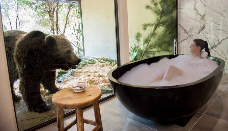 Nggak hanya menonton hiu, kamu bisa mandi dengan ditemani beruang coklat yang sedang berkumpul dengan kelompoknya. Lebih serunya lagi, kamu hanya dibatasi kaca transparan dengan si beruang.